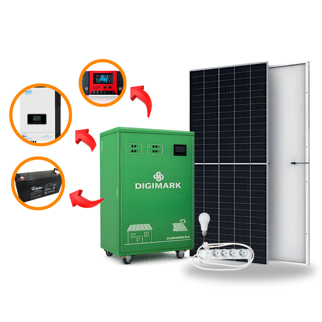The DIGIMARK 5KW Solar Box System is a high-capacity all-in-one solar power solution designed for dependable home and small business energy needs. It integrates a solar inverter, PV charge controller, and battery into a single compact unit for easy installation and use. Built for stronger performance, it provides reliable backup power and supports essential appliances during outages or off-grid use.